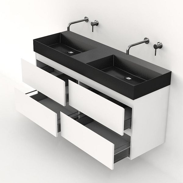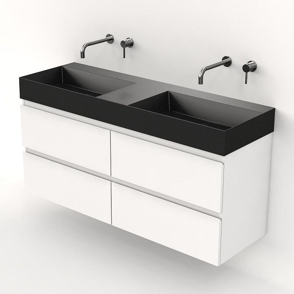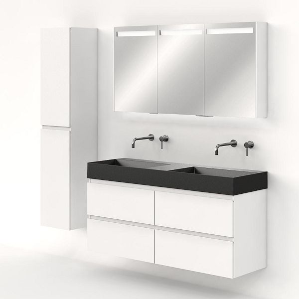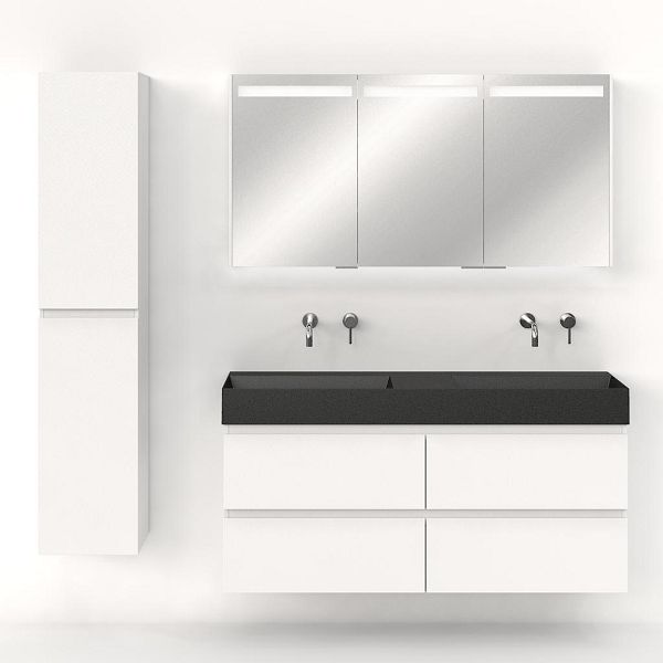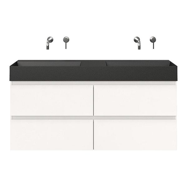 Greeploos badkamermeubel in de kleur wit mat is 140 cm breed. De wastafel is vervaardig in keramiek en heeft de kleur antraciet mat keramiek. Dit badkamermeubel met deze wastafel is leverbaar tussen de 60 cm t/m 160 cm