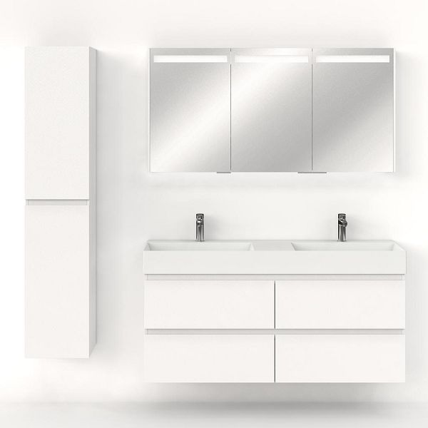 Greeploos badkamermeubel in de kleur wit mat is 140 cm breed. De wastafel is vervaardig in keramiek en heeft de kleur wit keramiek. Dit badkamermeubel met deze wastafel is leverbaar tussen de 60 cm t/m 160 cm