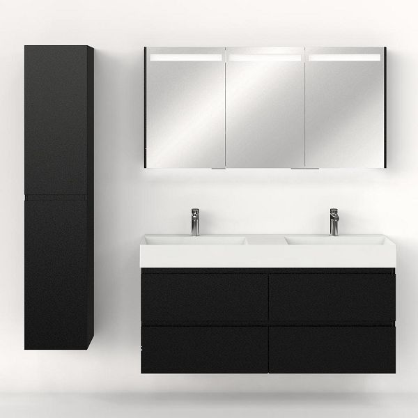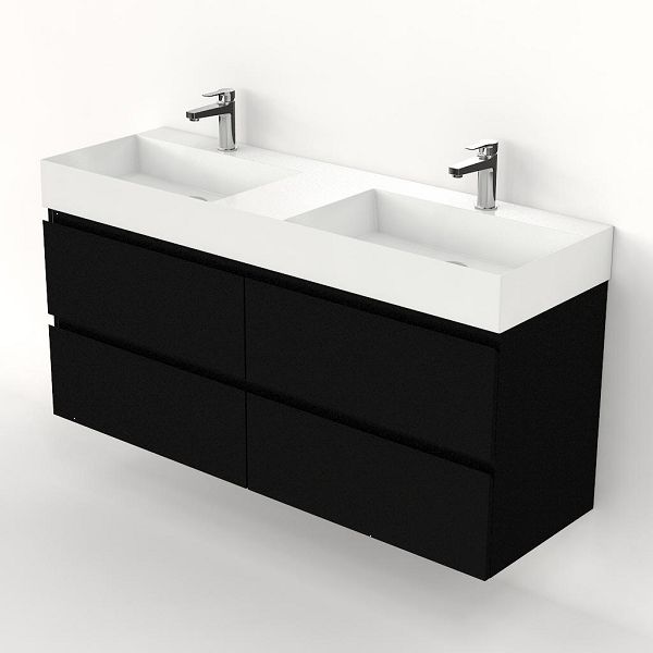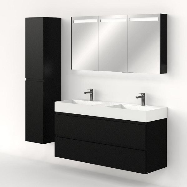 Greeploos badkamermeubel in de kleur zwart mat is 140 cm breed. De wastafel is vervaardig in keramiek en heeft de kleur wit keramiek. Dit badkamermeubel met deze wastafel is leverbaar tussen de 60 cm t/m 160 cm
