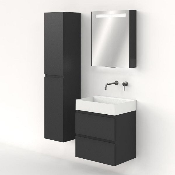Greeploos badkamermeubel in de kleur antraciet mat is 60 cm breed. De wastafel is vervaardig in keramiek en heeft de kleur wit mat keramiek. Dit badkamermeubel met deze wastafel is leverbaar tussen de 60 cm t/m 160 cm