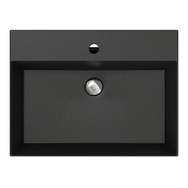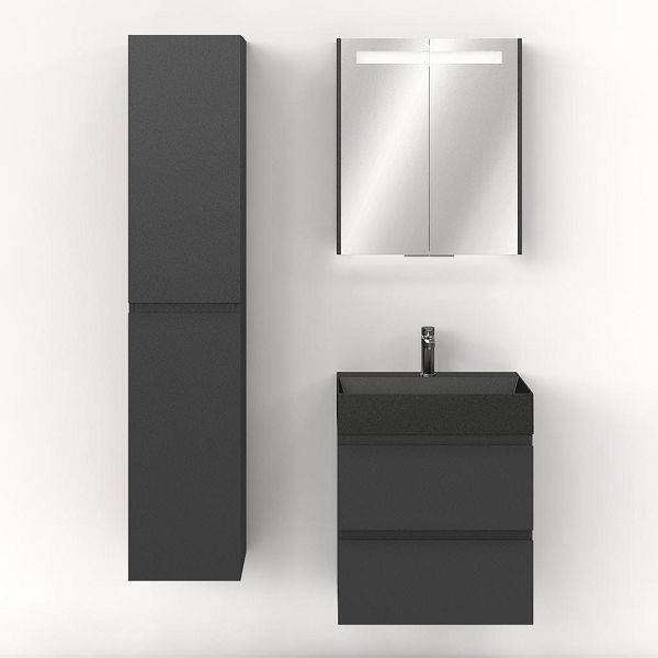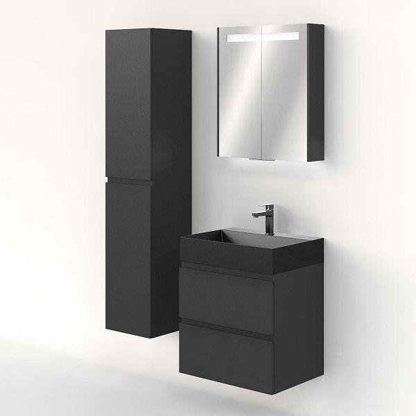 Greeploos badkamermeubel in de kleur antraciet mat is 60 cm breed. De wastafel is vervaardig in keramiek en heeft de kleur antraciet mat keramiek. Dit badkamermeubel met deze wastafel is leverbaar tussen de 60 cm t/m 160 cm