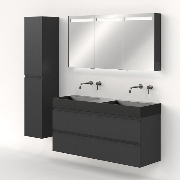 Greeploos badkamermeubel in de kleur antraciet mat is 140 cm breed. De wastafel is vervaardig in keramiek en heeft de kleur antraciet mat keramiek. Dit badkamermeubel met deze wastafel is leverbaar tussen de 60 cm t/m 160 cm