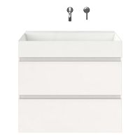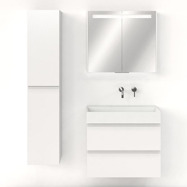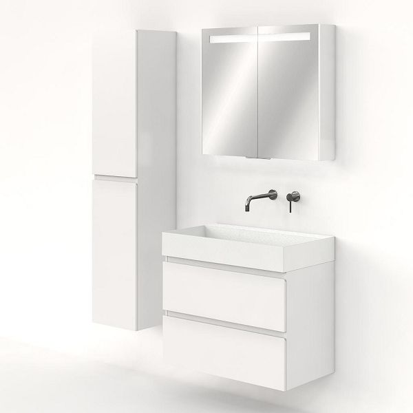 Greeploos badkamermeubel in de kleur wit hoogglans is 80 cm breed. De wastafel is vervaardig in keramiek en heeft de kleur wit mat keramiek. Dit badkamermeubel met deze wastafel is leverbaar tussen de 60 cm t/m 160 cm