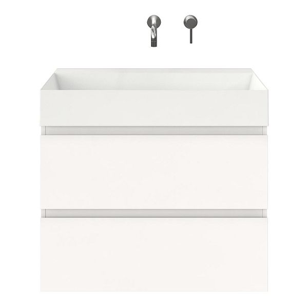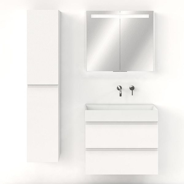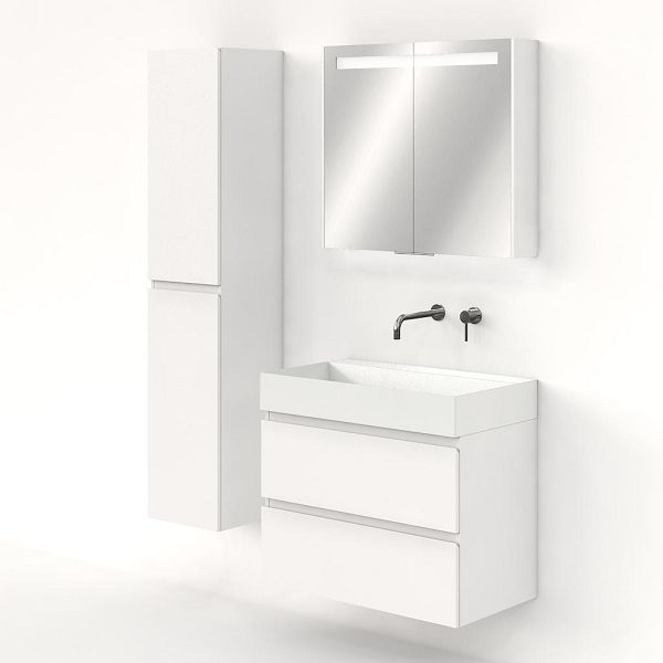 Greeploos badkamermeubel in de kleur wit mat is 80 cm breed. De wastafel is vervaardig in keramiek en heeft de kleur wit keramiek. Dit badkamermeubel met deze wastafel is leverbaar tussen de 60 cm t/m 160 cm
