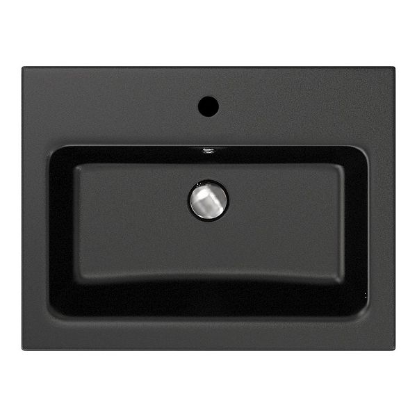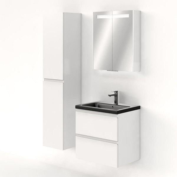 Greeploos badkamermeubel in de kleur wit hoogglans is 60 cm breed. De wastafel is vervaardig in keramiek en heeft de kleur zwart mat keramiek. Dit badkamermeubel met deze wastafel is leverbaar tussen de 60 cm t/m 120 cm