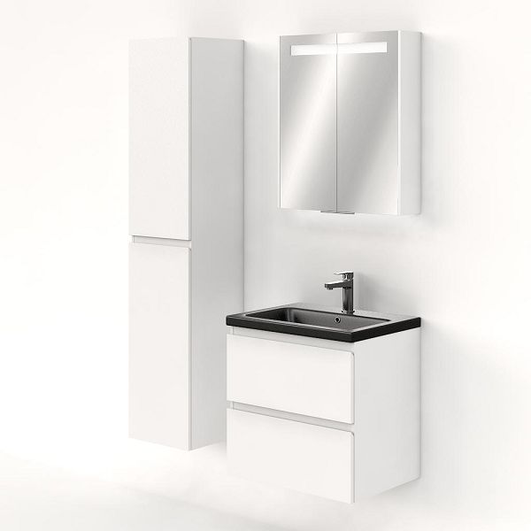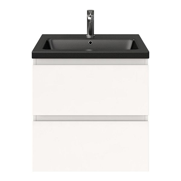 Greeploos badkamermeubel in de kleur wit mat is 60 cm breed. De wastafel is vervaardig in keramiek en heeft de kleur zwart mat keramiek. Dit badkamermeubel met deze wastafel is leverbaar tussen de 60 cm t/m 120 cm