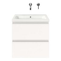 Greeploos badkamermeubel in de kleur wit mat is 60 cm breed. De wastafel is vervaardig in keramiek en heeft de kleur wit keramiek. Dit badkamermeubel met deze wastafel is leverbaar tussen de 60 cm t/m 120 cm