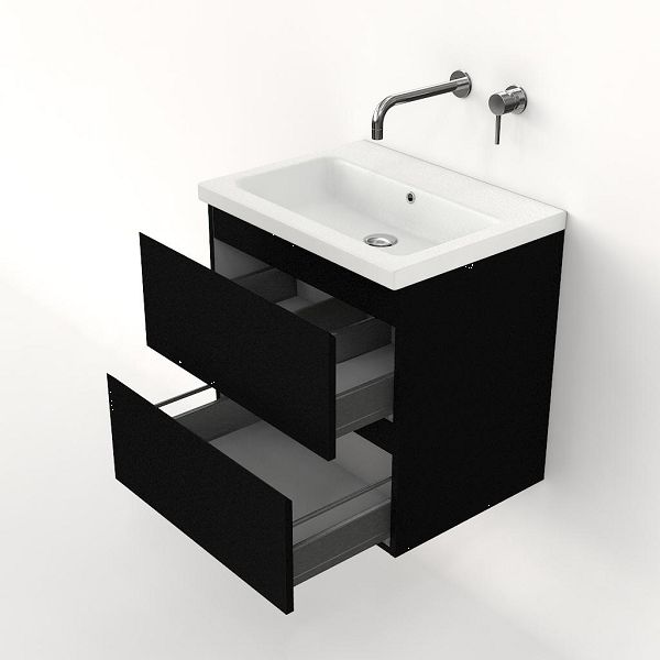 | | Bellanti Gisella/Amelia badmeubel 60x46 2 softclose laden zwart mat greeploos keramische wastafel wit mat zonder kraangaten |