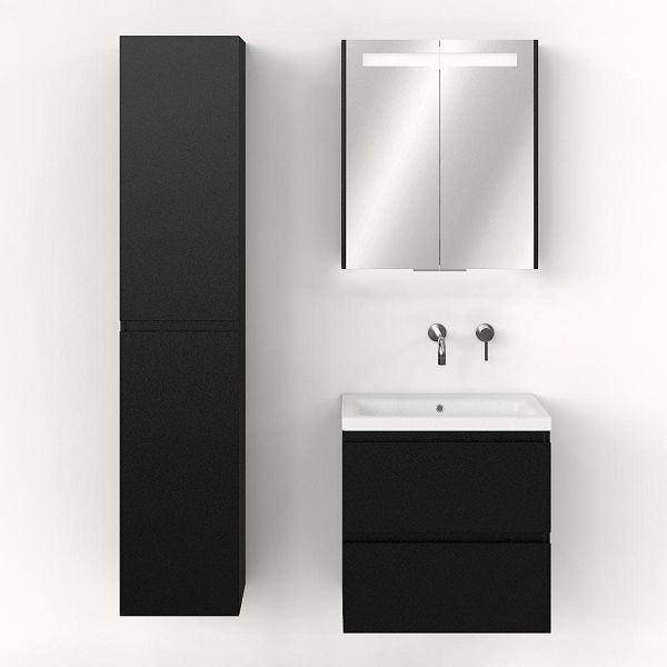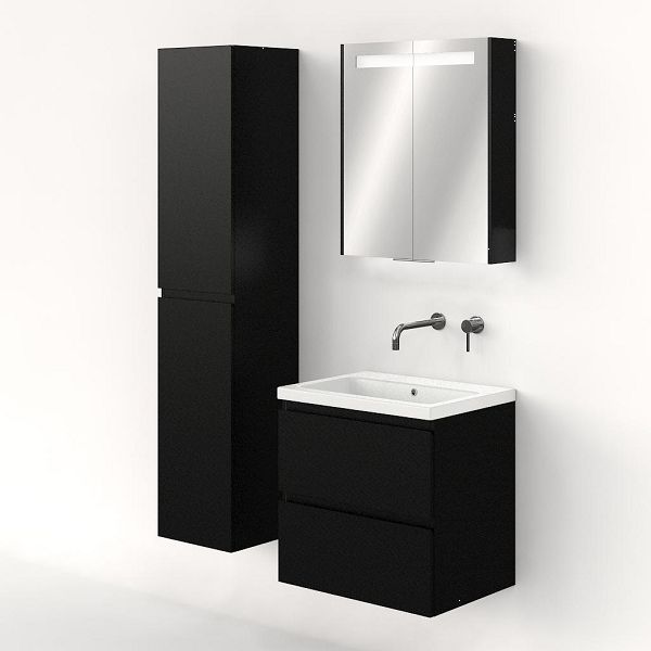 Greeploos badkamermeubel in de kleur zwart mat is 60 cm breed. De wastafel is vervaardig in keramiek en heeft de kleur wit mat keramiek. Dit badkamermeubel met deze wastafel is leverbaar tussen de 60 cm t/m 120 cm