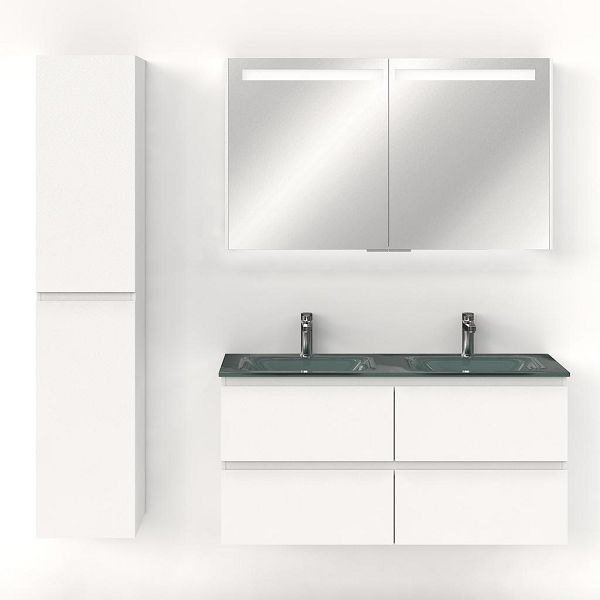 Greeploos badkamermeubel in de kleur wit mat is 120 cm breed. De wastafel is vervaardig in glas en heeft de kleur zilvergrijs. Dit badkamermeubel met deze wastafel is leverbaar tussen de 60 cm t/m 140 cm