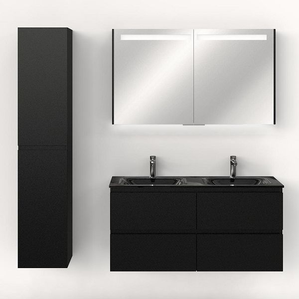 Greeploos badkamermeubel in de kleur zwart mat is 120 cm breed. De wastafel is vervaardig in glas en heeft de kleur zwart mat. Dit badkamermeubel met deze wastafel is leverbaar tussen de 60 cm t/m 140 cm