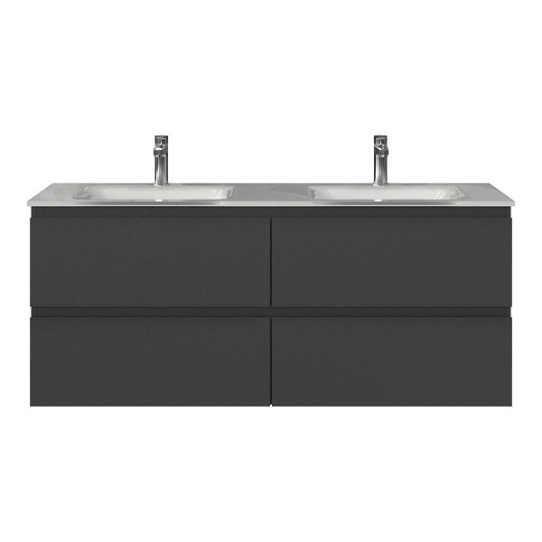 | | Bellanti Gisella/Glass badmeubel 140x46 4 softclose laden antraciet mat greeploos glazen wastafel dubbel wit met 2 kraangaten |