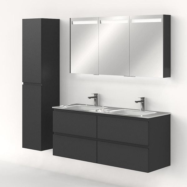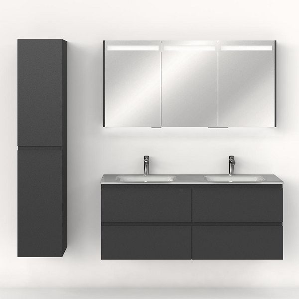 Greeploos badkamermeubel in de kleur antraciet mat is 140 cm breed. De wastafel is vervaardig in glas en heeft de kleur wit. Dit badkamermeubel met deze wastafel is leverbaar tussen de 60 cm t/m 140 cm