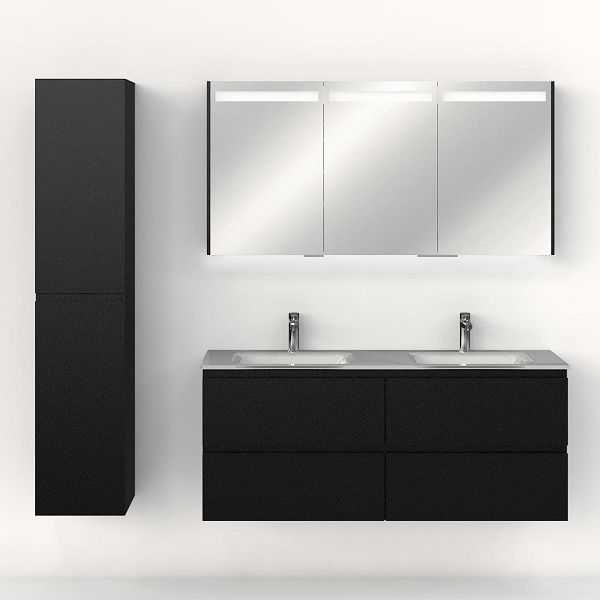 Greeploos badkamermeubel in de kleur zwart mat is 140 cm breed. De wastafel is vervaardig in glas en heeft de kleur wit. Dit badkamermeubel met deze wastafel is leverbaar tussen de 60 cm t/m 140 cm