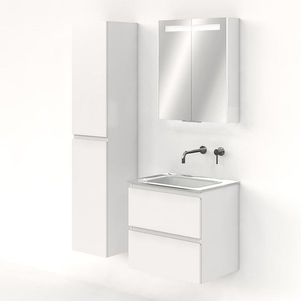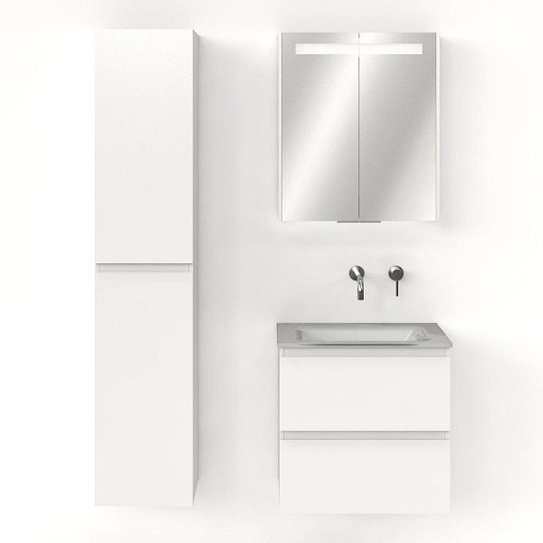 Greeploos badkamermeubel in de kleur wit hoogglans is 60 cm breed. De wastafel is vervaardig in glas en heeft de kleur wit. Dit badkamermeubel met deze wastafel is leverbaar tussen de 60 cm t/m 140 cm