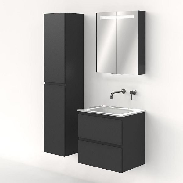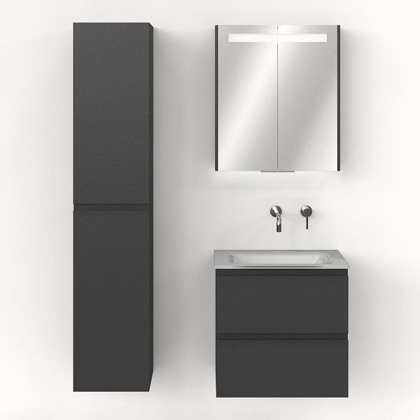 Greeploos badkamermeubel in de kleur antraciet mat is 60 cm breed. De wastafel is vervaardig in glas en heeft de kleur wit. Dit badkamermeubel met deze wastafel is leverbaar tussen de 60 cm t/m 140 cm