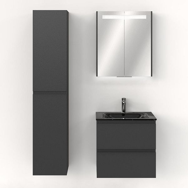 Greeploos badkamermeubel in de kleur antraciet mat is 60 cm breed. De wastafel is vervaardig in glas en heeft de kleur zwart mat. Dit badkamermeubel met deze wastafel is leverbaar tussen de 60 cm t/m 140 cm