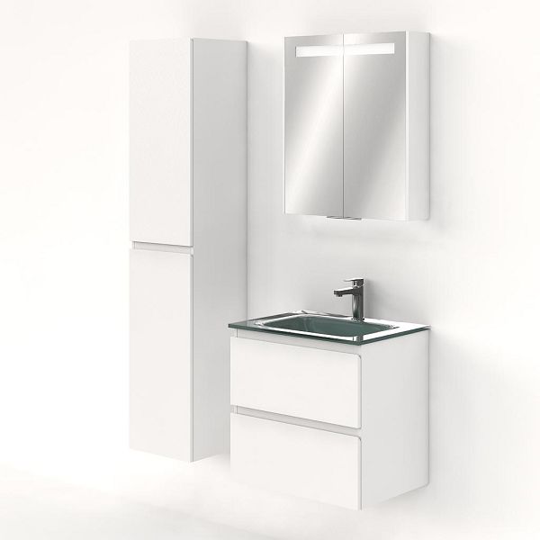 Greeploos badkamermeubel in de kleur wit mat is 60 cm breed. De wastafel is vervaardig in glas en heeft de kleur zilvergrijs. Dit badkamermeubel met deze wastafel is leverbaar tussen de 60 cm t/m 140 cm