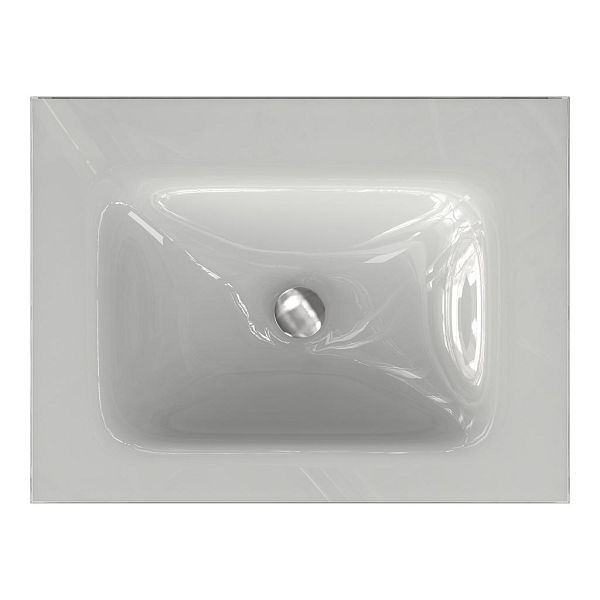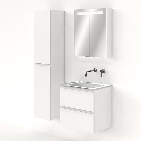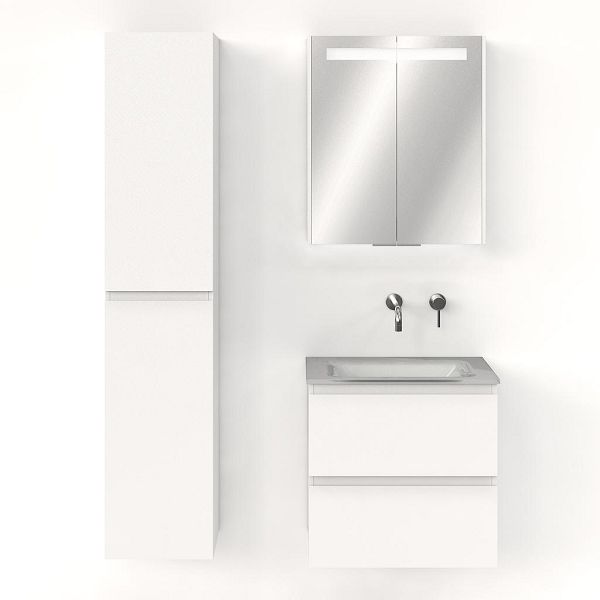 Greeploos badkamermeubel in de kleur wit mat is 60 cm breed. De wastafel is vervaardig in glas en heeft de kleur wit. Dit badkamermeubel met deze wastafel is leverbaar tussen de 60 cm t/m 140 cm