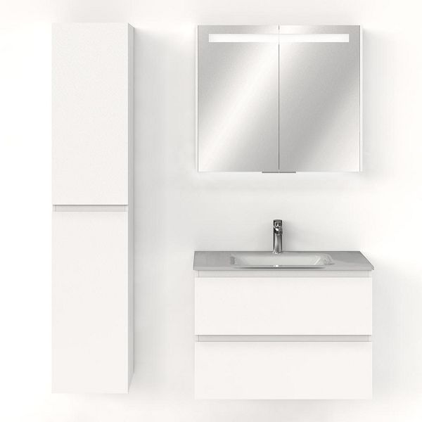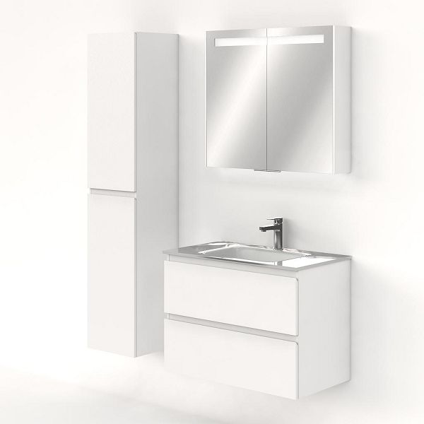 Greeploos badkamermeubel in de kleur wit mat is 80 cm breed. De wastafel is vervaardig in glas en heeft de kleur wit. Dit badkamermeubel met deze wastafel is leverbaar tussen de 60 cm t/m 140 cm