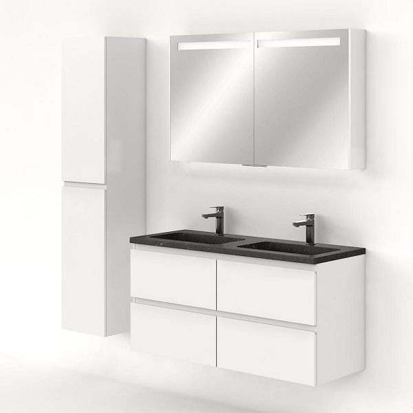 Greeploos badkamermeubel in de kleur wit hoogglans is 120 cm breed. De wastafel is vervaardig in natuursteen en heeft de kleur blue stone. Dit badkamermeubel met deze wastafel is leverbaar tussen de 60 cm t/m 120 cm