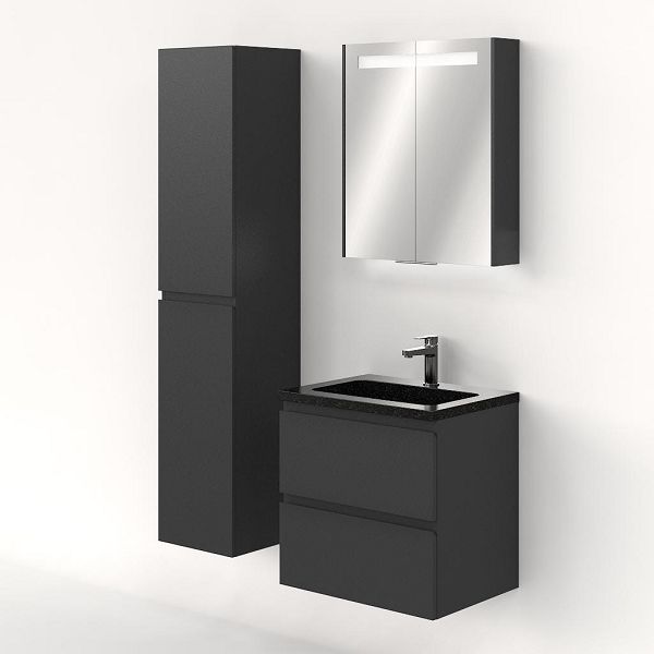 Greeploos badkamermeubel in de kleur antraciet mat is 60 cm breed. De wastafel is vervaardig in natuursteen en heeft de kleur shanxi black. Dit badkamermeubel met deze wastafel is leverbaar tussen de 60 cm t/m 120 cm