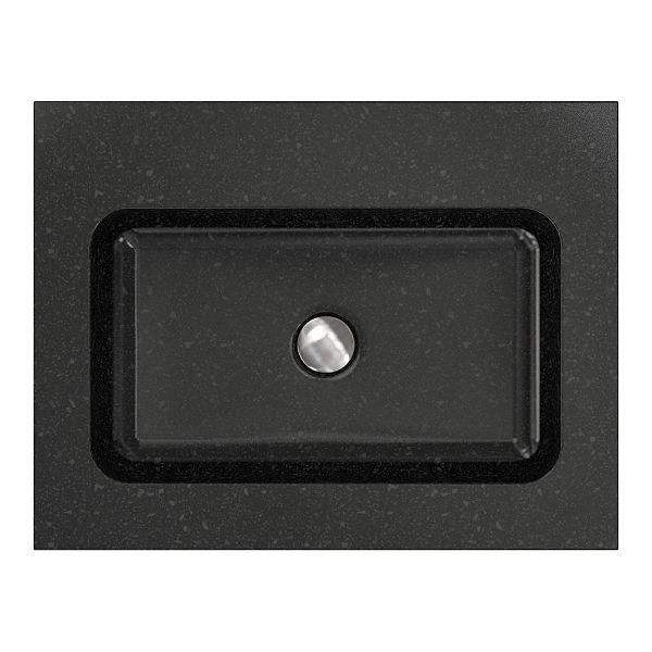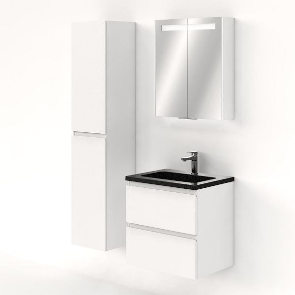 Greeploos badkamermeubel in de kleur wit mat is 60 cm breed. De wastafel is vervaardig in natuursteen en heeft de kleur shanxi black. Dit badkamermeubel met deze wastafel is leverbaar tussen de 60 cm t/m 120 cm