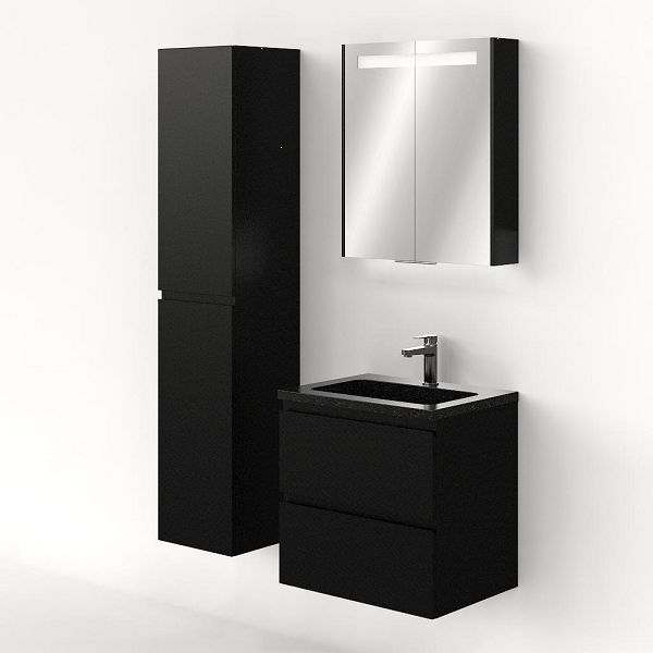 Greeploos badkamermeubel in de kleur zwart mat is 60 cm breed. De wastafel is vervaardig in natuursteen en heeft de kleur shanxi black. Dit badkamermeubel met deze wastafel is leverbaar tussen de 60 cm t/m 120 cm
