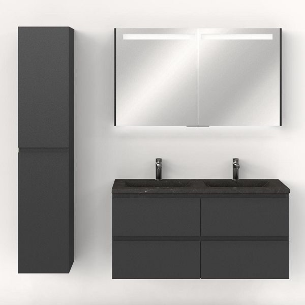 Greeploos badkamermeubel in de kleur antraciet mat is 120 cm breed. De wastafel is vervaardig in natuursteen en heeft de kleur blue stone. Dit badkamermeubel met deze wastafel is leverbaar tussen de 60 cm t/m 120 cm