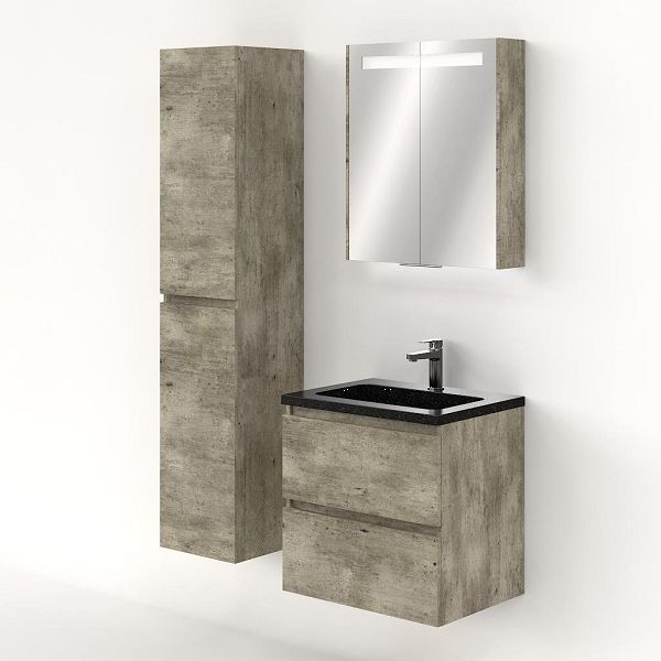Greeploos badkamermeubel in de kleur steigerhout licht grijs is 60 cm breed. De wastafel is vervaardig in natuursteen en heeft de kleur shanxi black. Dit badkamermeubel met deze wastafel is leverbaar tussen de 60 cm t/m 120 cm
