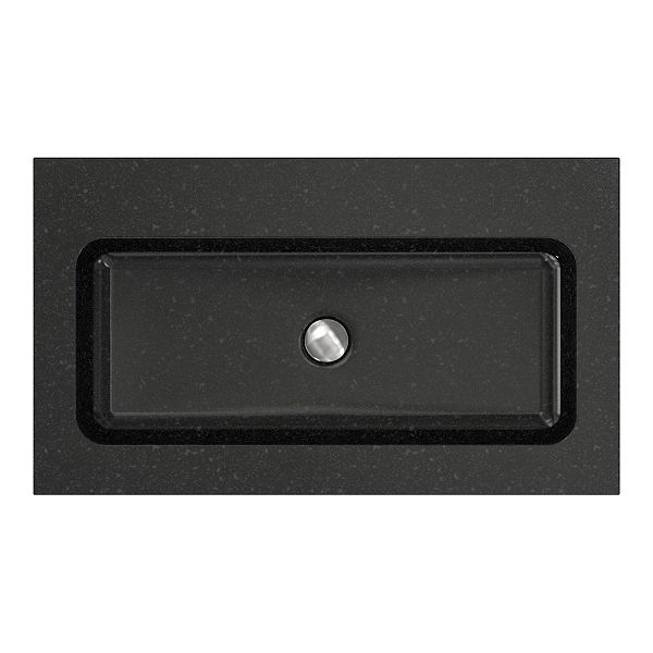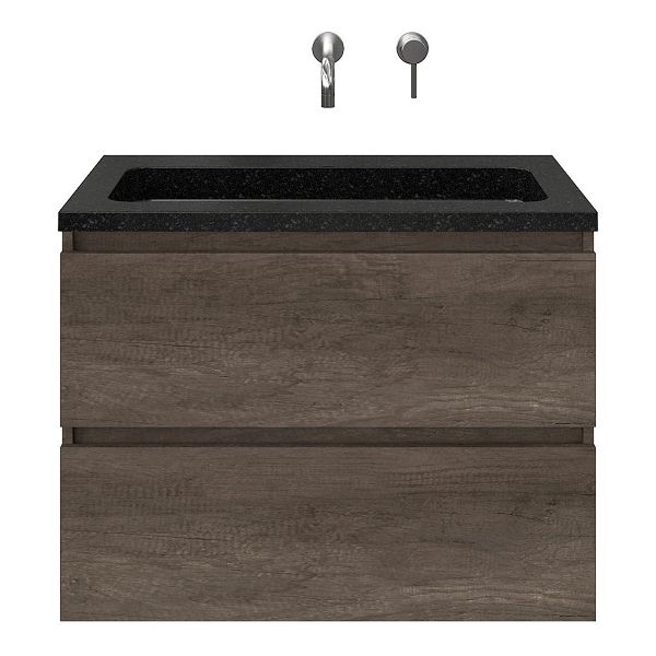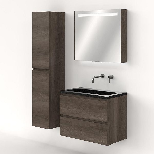 Greeploos badkamermeubel in de kleur olm donker grijs is 80 cm breed. De wastafel is vervaardig in natuursteen en heeft de kleur shanxi black. Dit badkamermeubel met deze wastafel is leverbaar tussen de 60 cm t/m 120 cm