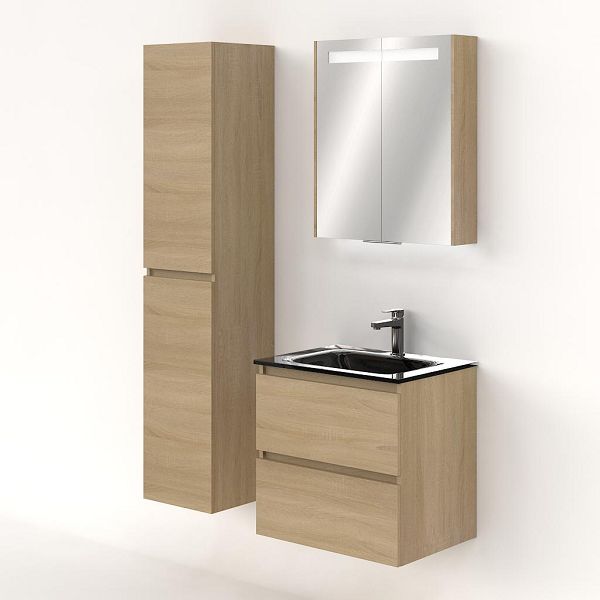 Greeploos badkamermeubel in de kleur eiken licht is 60 cm breed. De wastafel is vervaardig in glas en heeft de kleur zwart mat. Dit badkamermeubel met deze wastafel is leverbaar tussen de 60 cm t/m 120 cm