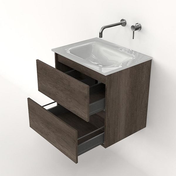 | | Bellanti Elena/Glass badmeubel 60x46 2 softclose laden olm donker grijs greeploos glazen wastafel wit zonder kraangaten |