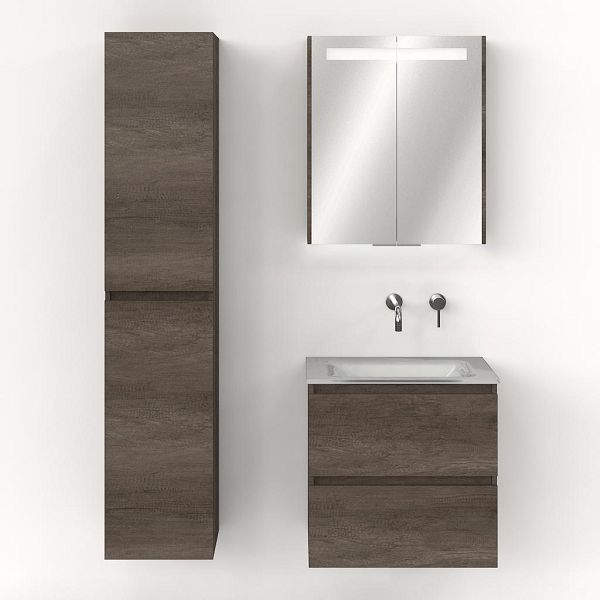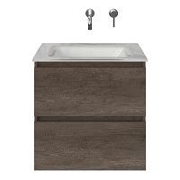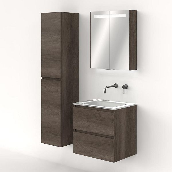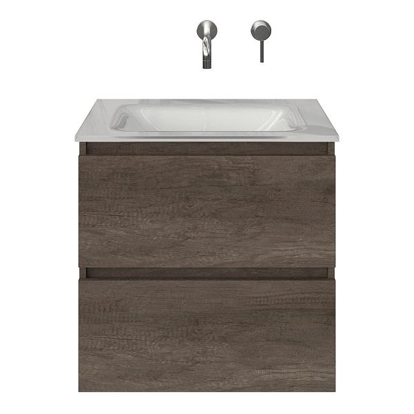 Greeploos badkamermeubel in de kleur olm donker grijs is 60 cm breed. De wastafel is vervaardig in glas en heeft de kleur wit. Dit badkamermeubel met deze wastafel is leverbaar tussen de 60 cm t/m 120 cm