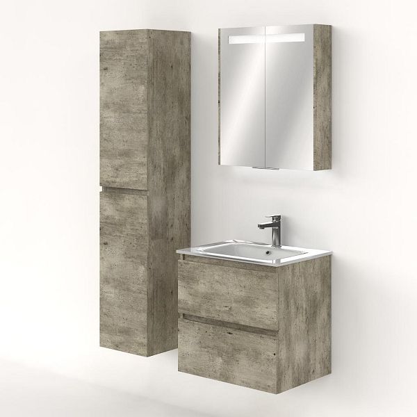 Greeploos badkamermeubel in de kleur steigerhout licht grijs is 60 cm breed. De wastafel is vervaardig in glas en heeft de kleur wit. Dit badkamermeubel met deze wastafel is leverbaar tussen de 60 cm t/m 120 cm