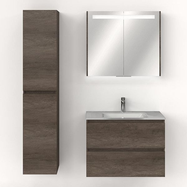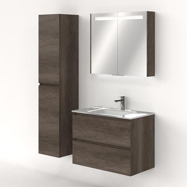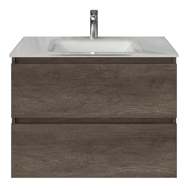 Greeploos badkamermeubel in de kleur olm donker grijs is 80 cm breed. De wastafel is vervaardig in glas en heeft de kleur wit. Dit badkamermeubel met deze wastafel is leverbaar tussen de 60 cm t/m 120 cm