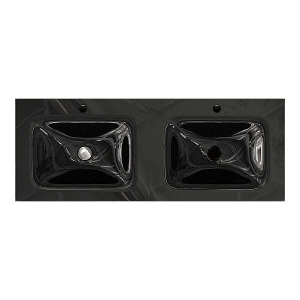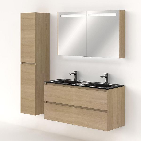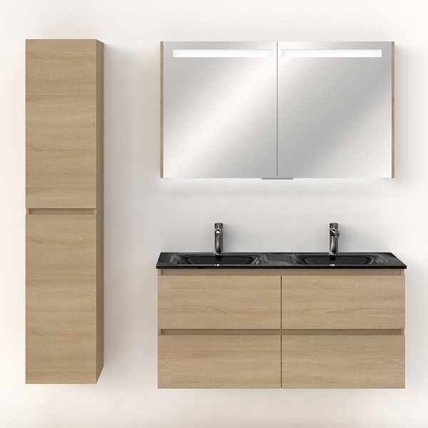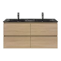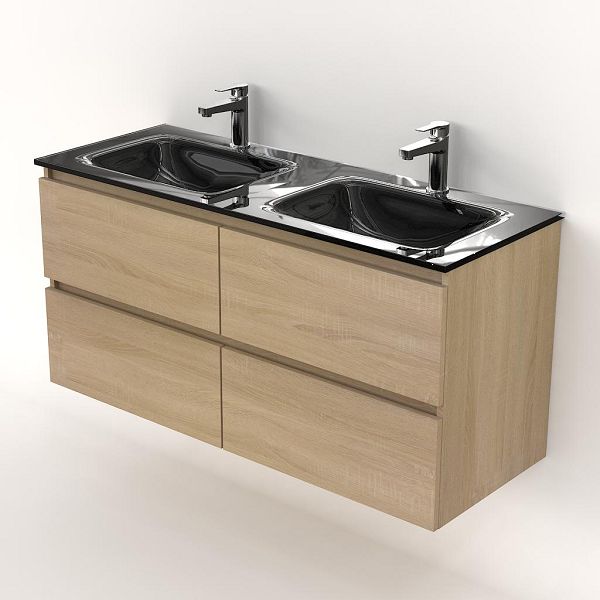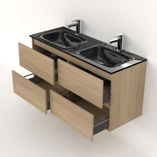 | | Bellanti Elena/Glass badmeubel 120x46 4 softclose laden eiken licht greeploos glazen wastafel dubbel zwart met 2 kraangaten |