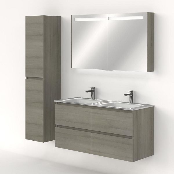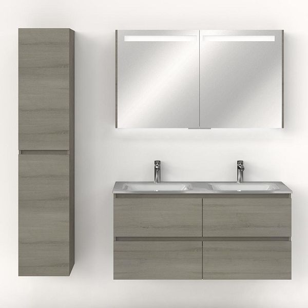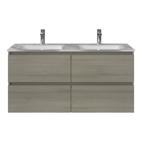 | Bellanti Elena/Glass badmeubel 120x46 4 softclose laden eiken licht grijs greeploos glazen wastafel dubbel wit met 2 kraangaten |
