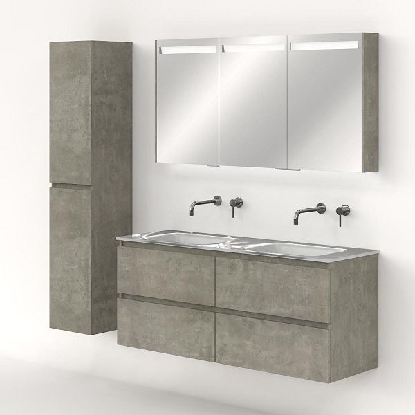 Greeploos badkamermeubel in de kleur beton structuur is 140 cm breed. De wastafel is vervaardig in glas en heeft de kleur wit. Dit badkamermeubel met deze wastafel is leverbaar tussen de 60 cm t/m 120 cm