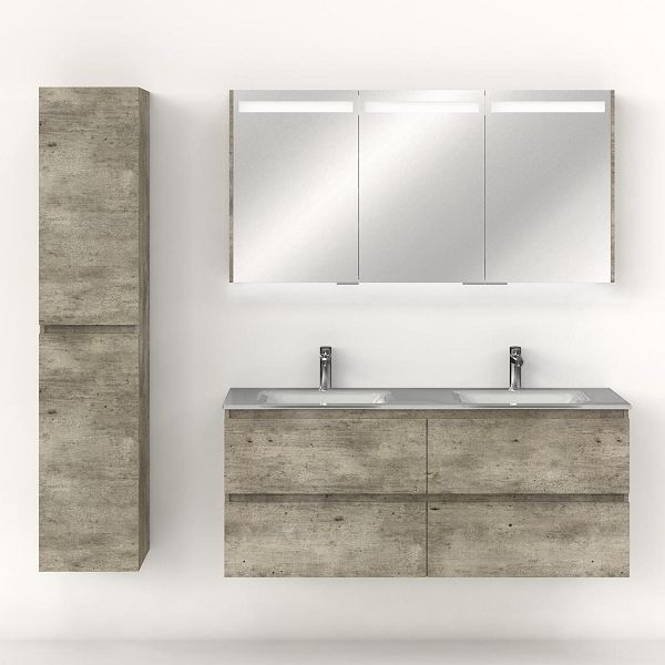 Greeploos badkamermeubel in de kleur steigerhout licht grijs is 140 cm breed. De wastafel is vervaardig in glas en heeft de kleur wit. Dit badkamermeubel met deze wastafel is leverbaar tussen de 60 cm t/m 120 cm