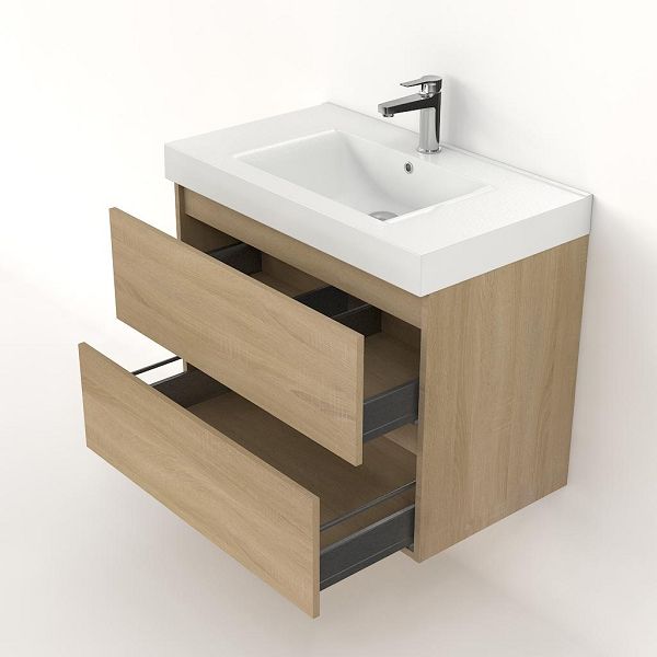 | | Bellanti Elena/Wave badmeubel 80x46 2 softclose laden eiken licht greeploos polystone wastafel wit met 1 kraangat |