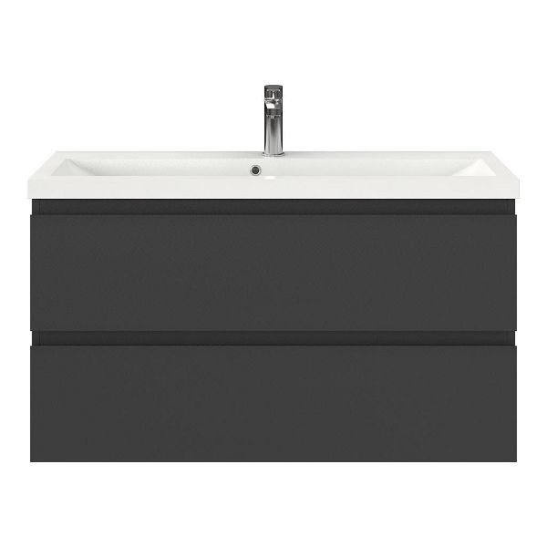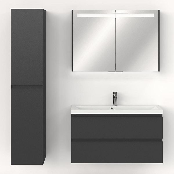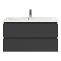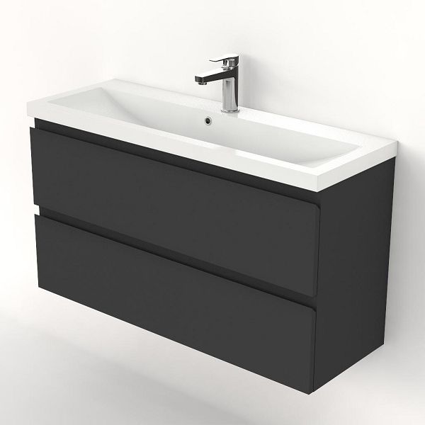 Ondiepe greeploos badkamermeubel in de kleur antraciet mat. Badmeubel is praktisch voor een compact badkamer. Het meubel van 100 cm breed is er. De wastafel is vervaardig in polystone en heeft de kleur wit. Dit badkamermeubel met deze wastafel is leverbaar tussen de 60 cm t/m 100 cm.