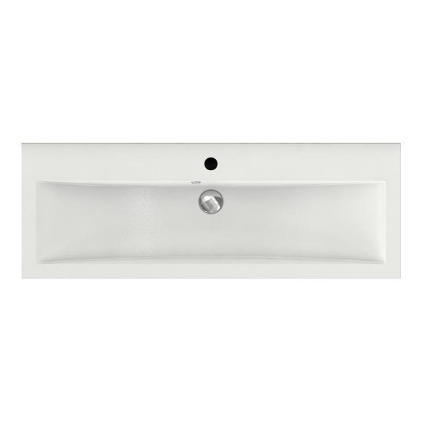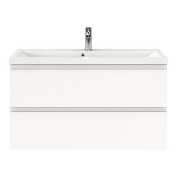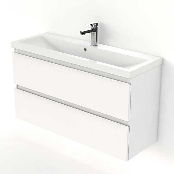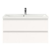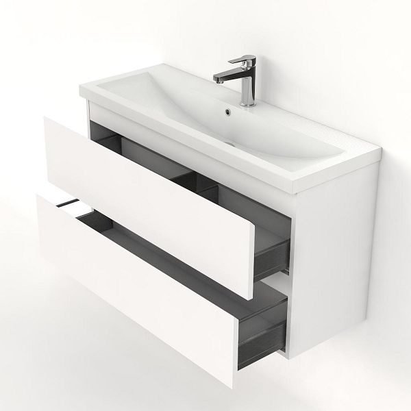Ondiepe greeploos badkamermeubel in de kleur wit mat. Badmeubel is praktisch voor een compact badkamer. Het meubel van 100 cm breed is er.  De wastafel is vervaardig in polystone en heeft de kleur wit. Dit badkamermeubel met deze wastafel is leverbaar tussen de 60 cm t/m 100 cm.
