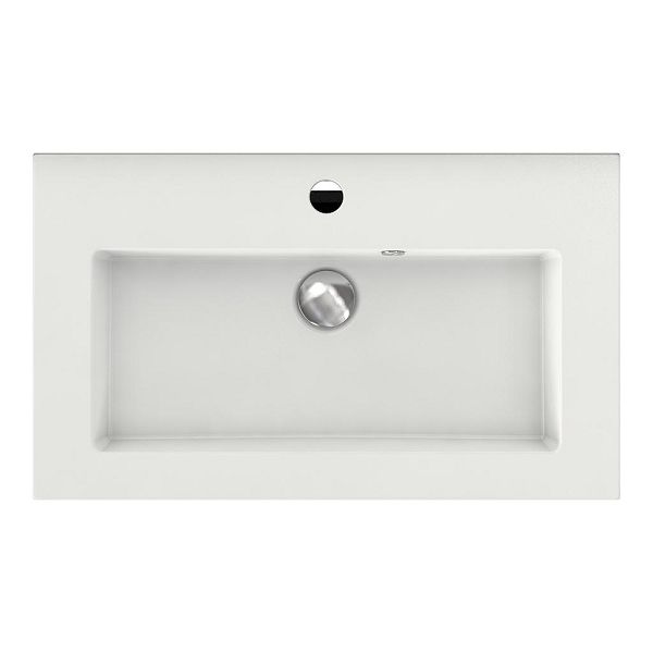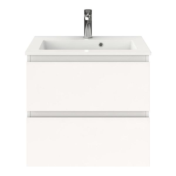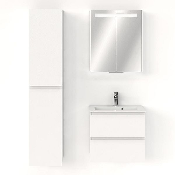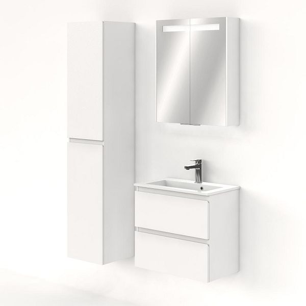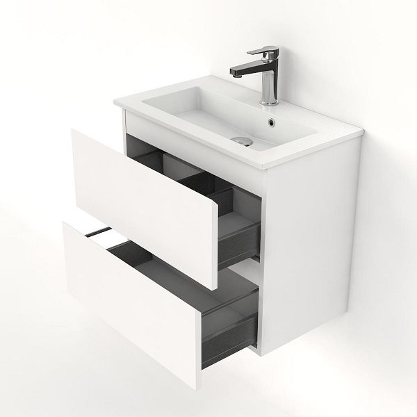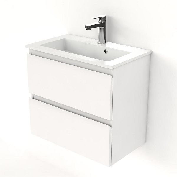 Ondiepe greeploos badkamermeubel in de kleur wit mat. Badmeubel is praktisch voor een compact badkamer. Het meubel van 60 cm breed is er. De wastafel is vervaardig in keramiek en heeft de kleur wit keramiek. Dit badkamermeubel met deze wastafel is leverbaar tussen de 60 cm t/m 100 cm.