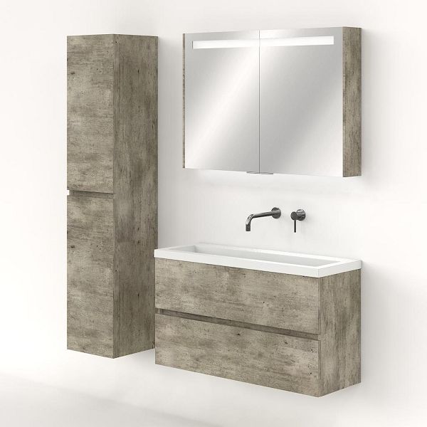 Ondiepe greeploos badkamermeubel in de kleur steigerhout licht grijs. Badmeubel is praktisch voor een compact badkamer. Het meubel van 100 cm breed is er. De wastafel is vervaardig in polystone en heeft de kleur wit. Dit badkamermeubel met deze wastafel is leverbaar tussen de 60 cm t/m 100 cm.