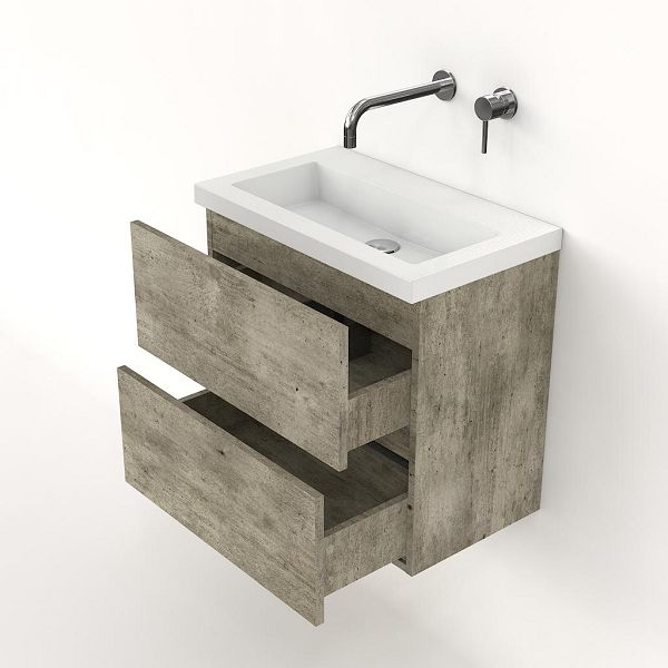 | Bellanti Fabia/Esta ondiep badmeubel 60x36 2 softclose laden steigerhout licht grijs greeploos polystone wastafel wit zonder kraangaten |