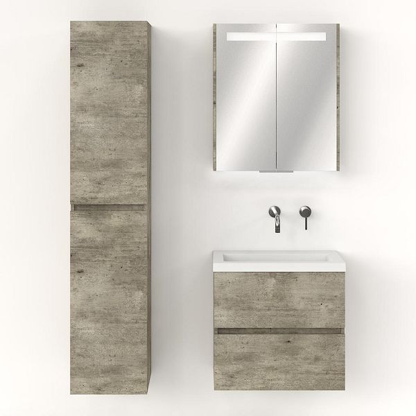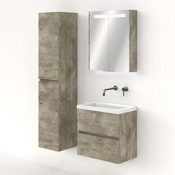 Ondiepe greeploos badkamermeubel in de kleur steigerhout licht grijs. Badmeubel is praktisch voor een compact badkamer. Het meubel van 60 cm breed is er. De wastafel is vervaardig in polystone en heeft de kleur wit. Dit badkamermeubel met deze wastafel is leverbaar tussen de 60 cm t/m 100 cm.