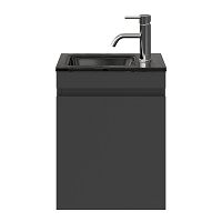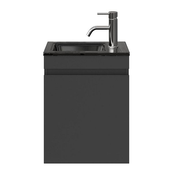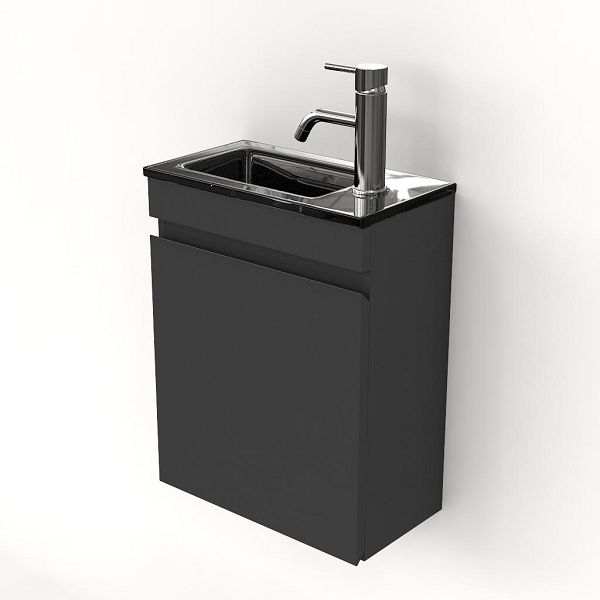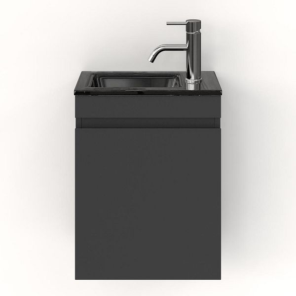 Greeploos fonteinmeubel in de kleur antraciet mat is 40 cm breed. De wastafel is vervaardig in glas en heeft de kleur zwart glas met 1 kraangaten