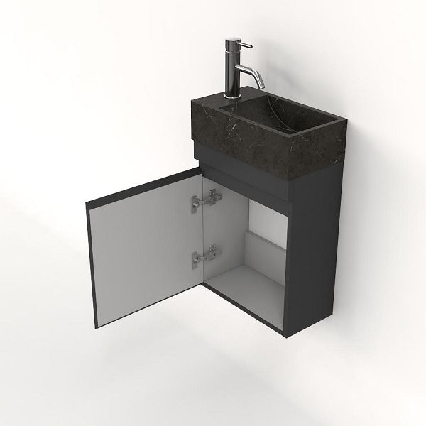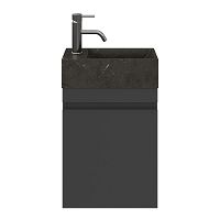 Greeploos fonteinmeubel in de kleur antraciet mat is 40 cm breed. De wastafel is vervaardig in natuursteen en heeft de kleur blue stone met 1 kraangaten