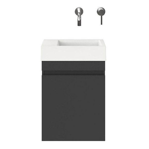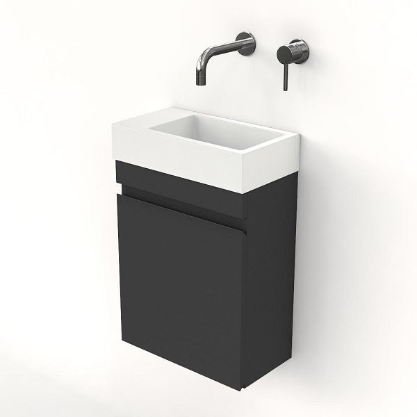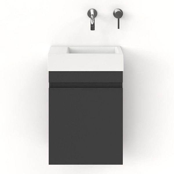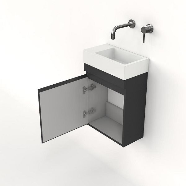 Greeploos fonteinmeubel in de kleur antraciet mat is 40 cm breed. De wastafel is vervaardig in polystone en heeft de kleur wit polystone met 0 kraangaten